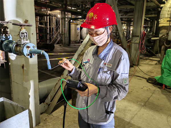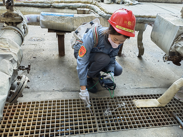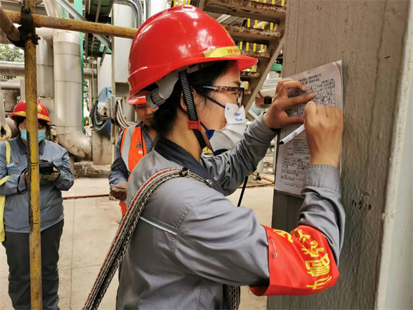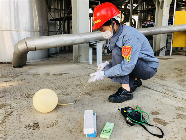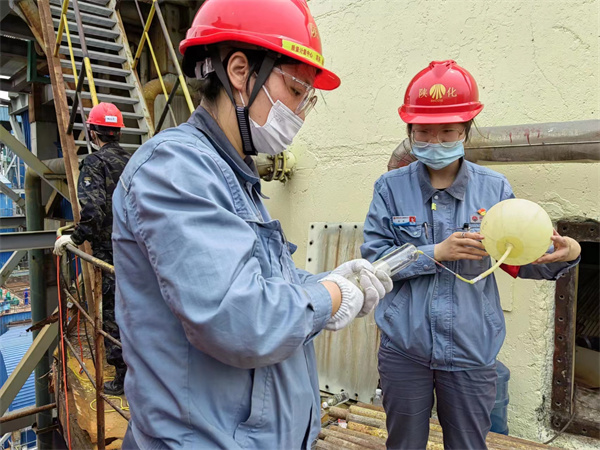 7點整到達檢修地點,各檢驗分隊隊長集合隊員,對一天的人員組隊情況進行安排部署,并強調安全動火分析要點及票證填寫注意事項。待檢修人員辦理好票證,檢修現場的空間動火、管道動火、受限空間分析接踵而至,質檢女工們“來者不拒”,配合分廠做好每一個安全分析。管廊下,塔頂上,設備旁,錯綜復雜的檢修現場,隨處都可以看到背著動火包的她們,忙而不亂,急而不慌。